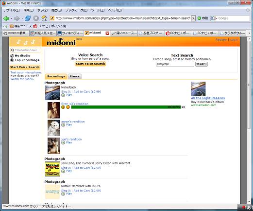 midomiは、鼻歌で検索できる楽曲検索サービスだ。PCに接続したマイクから鼻歌を吹き込めば、データベースと照合し、数秒で曲名・歌手名を探し出してくれる。メロディーが少しずれていたり、テンポがおかしかったり、キーが原曲と違ってもOKだ。 鼻歌はハミングでも口笛でもいいが、歌詞付きで歌えば検索精度は上がる。歌詞も照合しているためで、同じメロディーで歌詞の異なる曲(「キラキラ星」と「ABCの歌」など)も、別の曲として認識・検索してくれる。 http://www.itmedia.co.jp/news/articles/0703/16/news099.html ▼続き▼個人的意見 ニコニコ動画20万人に拡大。近く30万人に。