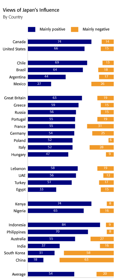 日本については、25カ国で「肯定的影響」との意見が「否定的」を上回り、中でもインドネシアでは8割以上が日本を評価。ただ、中国と韓国では「否定的」とした人がいずれも約6割を占めた。