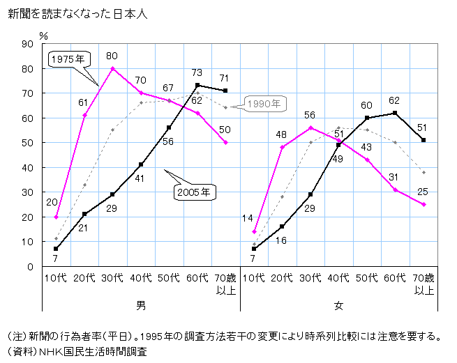 男30代は1975年に80%が新聞を読んでいたのに対して、2005年には29%しか読んで